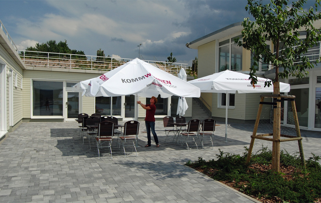 Vorbei die Zeit der kleinen Schirmchen: Am Kiosk im Hafengebäude stehen jetzt vier große Sonnenschirme. Da sie eckig sind und passend zusammengestellt wurden, ist darunter ein herrlich schattiges Plätzchen entstanden. Cornelia Kühnel vom Team der Villa Ephraim, das den Kiosk und künftig das gesamte Hafengebäude betreibt, hat schon einige Übung im Öffnen der Schirme. Schließlich ist der Kiosk an fünf Tagen in der Woche geöffnet: mittwochs bis sonntags, jeweils 11 bis 19 Uhr. Ein idealer Ort für eine Pause beim Bummel oder der Fahrradtour um den Berzdorfer See. Bei passendem Wetter lassen sich auch die An- und Ablegemanöver der Segler gut beobachten. Oder die Segelschüler des Augustum-Annengymnasiums, die im Hafen derzeit einen mehrwöchigen Kurs durchführen.