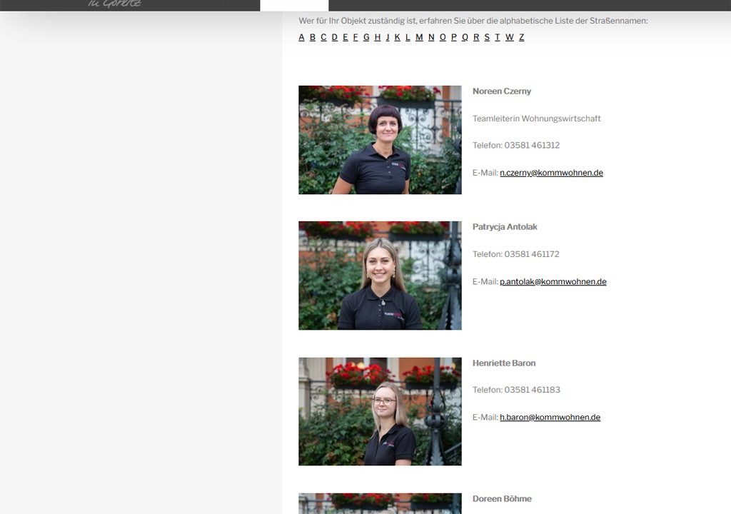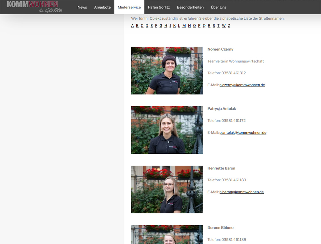 Welcher Kundenbetreuer sich um welches Objekt kümmert, ist in einer neuen Übersicht auf unserer Homepage im Bereich Mieterservice zu finden. Alphabetisch sortiert sind dort unsere Objekte aufgeführt, sodass jeder Mieter nur nach seiner Adresse suchen muss. Einige haben die Tabelle vielleicht auch schon im aktuellen Mieterjournal entdeckt. Damit stehen zwei digitale Möglichkeiten zur Verfügung, falls der Aushang im Haus, der seit Dezember aktualisiert ist, gerade nicht greifbar ist. Oder falls der Mietvertrag, der den richtigen Kontakt ebenfalls enthält, aus der Zeit vor der Umstellung stammt.