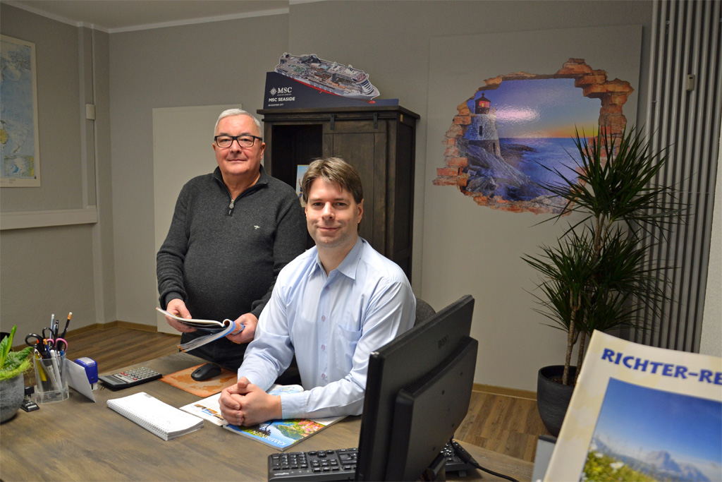 Die sind nämlich durchaus bemerkenswert. Mario Kosubek hat 1994 seine Lehre im Reisebüro Richter begonnen, Michael Richter war sein Chef und Ausbilder. Nun, nach 25 Jahren Zusammenarbeit, haben sie die Rollen getauscht. Mario Kosubek ist der Chef, Michael Richter der Angestellte.