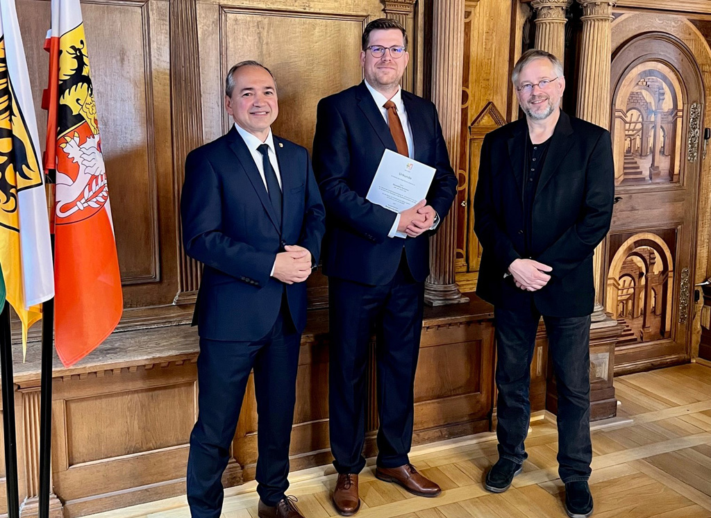 Foto: ©Stadtverwaltung Görlitz: Benedikt Hummel (w środku) otrzymał w obecności Michaela Wielera (z prawej) akt nominacji od Octaviana Ursu.