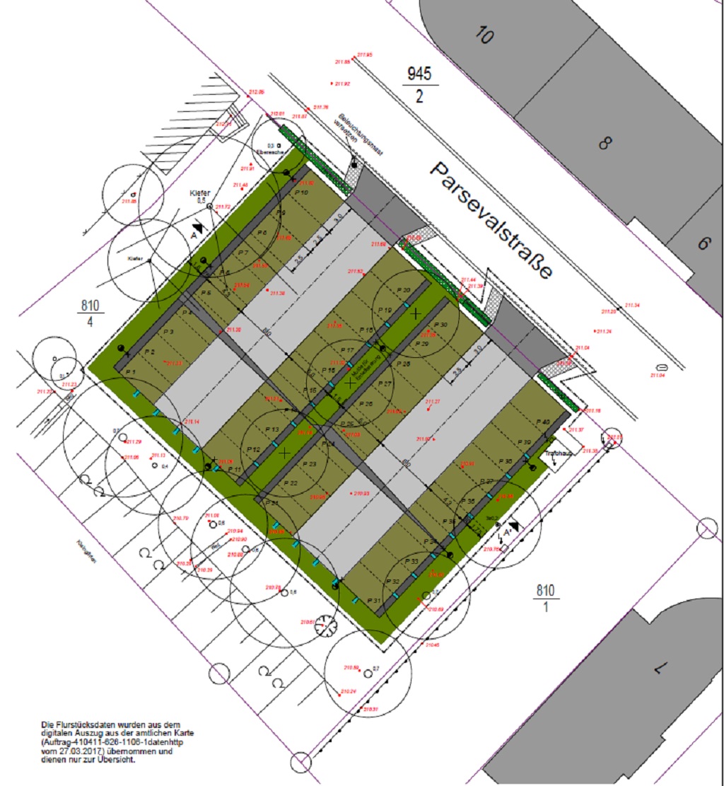 Die geplante Parkfläche wird lediglich für die Fahrspur asphaltiert. Die Stellflächen selbst bestehen aus Rasengittersteinen, sodass niemand eine Vollversiegelung der bislang grünen Flächen befürchten muss. Es werden neue Bäume gepflanzt, die für Schatten sorgen. Früher war die kleine Parkfläche ein Spielplatz. Die Spielgeräte sind jedoch schon seit längerer Zeit abgebaut.