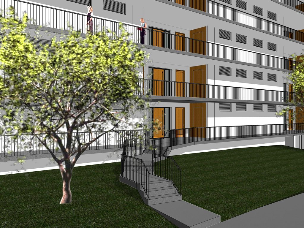 Access to the block will be regulated completely differently in the future. The new barrier-free main entrance is then in house number 12. There you go to the elevator, via which all floors are accessible. The entrances numbered 10 and 14 lead to the staircases. The five arcades on the individual floors are the entrances to the apartments. All in all, the block has only one house number and becomes Arthur-Ullrich-Street 16.