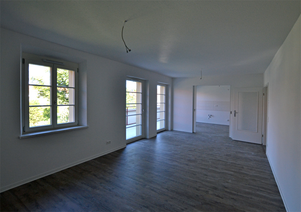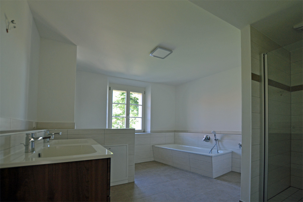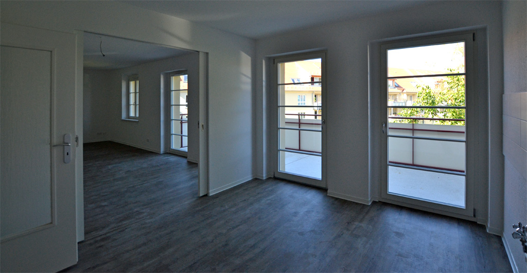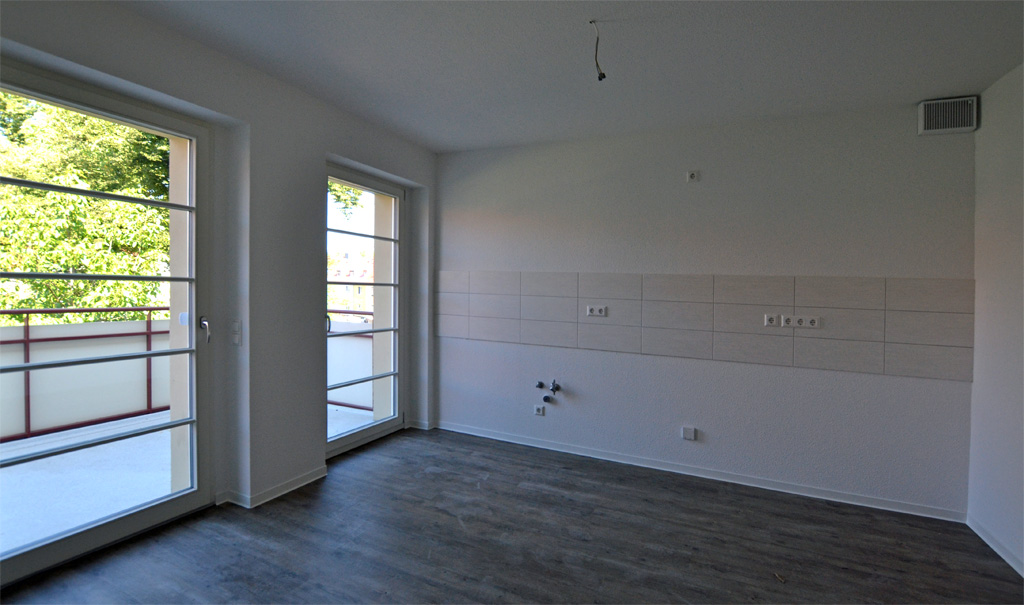 Miejsce na wyścigi jeździków jest już gotowy. Dzięki dużym drzwiom łączącym kuchnię z salonem cała rodzina w jednej chwili może znaleźć się razem. Prysznic, podwójna umywalka i wanna w łazience także są już gotowe. Słońce świeci na olbrzymim balkonie. To, czego tylko brakuje, to rodzice i ich dzieci. Do wykonania pozostało jeszcze kilka drobnych prac, a wtedy nasze trzy rodzinne apartamenty przy Frauenburgstraße zostaną ukończone.