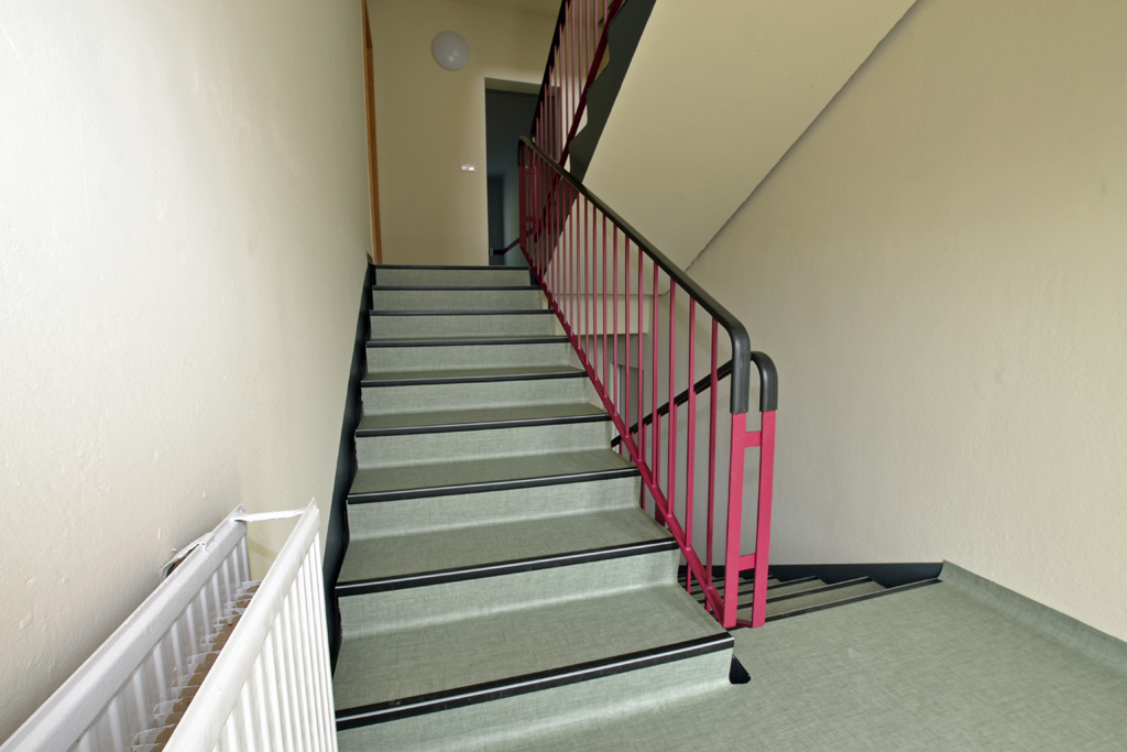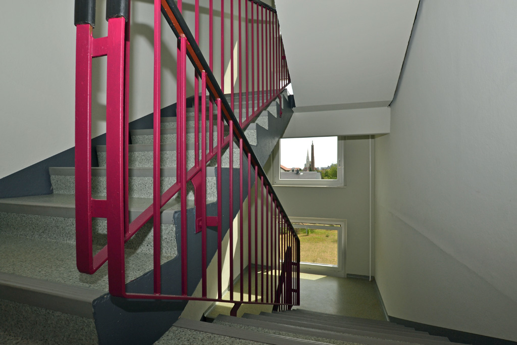 Es sind nicht nur die großen, auffälligen Sanierungen. Wir nehmen uns gern auch kleinere Sachen vor. So wie an der Hohen Straße. Die Treppenhäuser der Hausnummern 15, 16 und 17 haben einen frischen Anstrich bekommen. Die Geländer der Treppen leuchten nun im KommWohnen-Farbton. Und auch die Fußbodenbeläge sind erneuert. So macht es doch gleich wieder viel mehr Freude, nach Hause zu kommen…