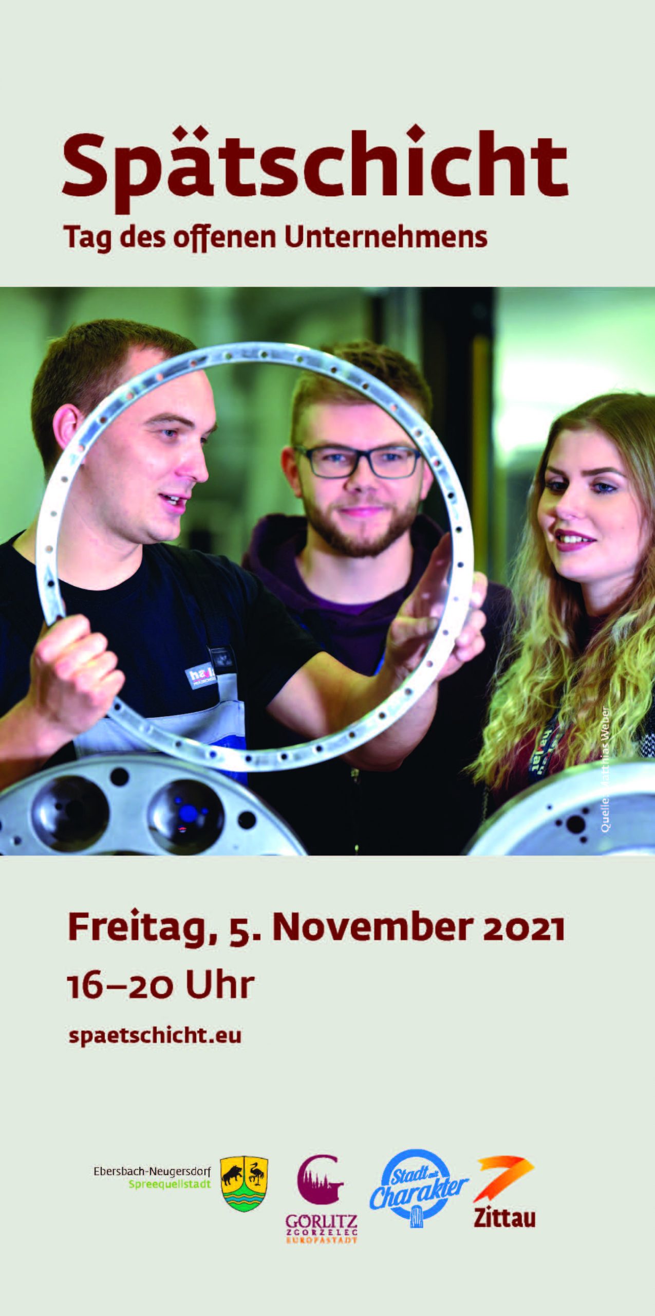 Save the date: Am 5. November bekommen alle Interessierten die Möglichkeit, unser Unternehmen näher kennenzulernen. Wir beteiligen uns an der landkreisweiten Aktion „Spätschicht – Tag des offenen Unternehmens“. Veranstalter sind die Wirtschaftsförderer der Städte Zittau, Weißwasser, Görlitz und Ebersbach-Neugersdorf.