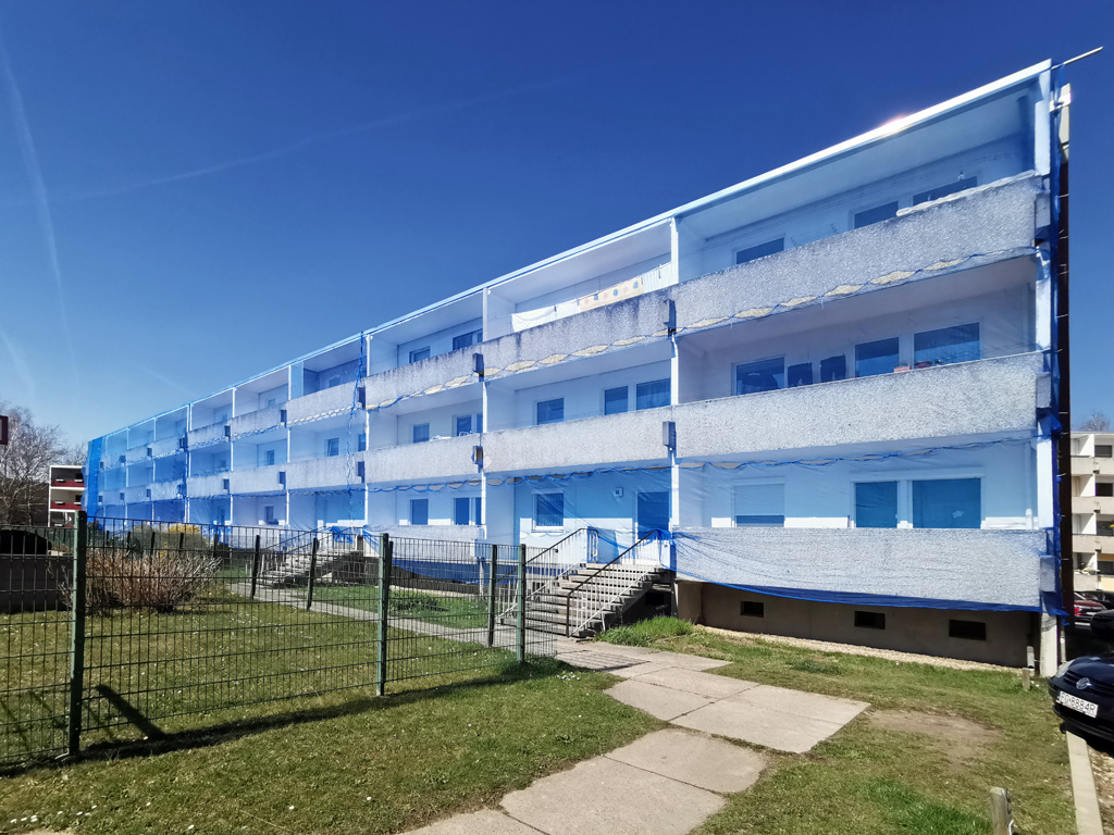 Nach Ostern geht es mit dem Abriss der Balkone an der Hofseite so richtig los. Über die Feiertage möchten wir unseren Mieterinnen und Mietern den Lärm und Dreck ersparen. Im Laufe der nächsten Monate bekommt der Wohnblock dann eine moderne Dämmung mit einem Wärmedämmverbundsystem, dazu einen neuen Anstrich in unserem Design.