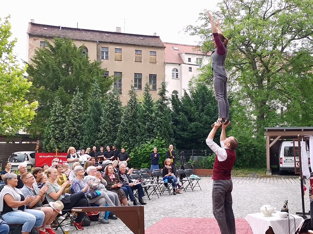 War das ein tolles Wochenende! Zwei Tage lang Theater, Akrobatik und Musik im Hof unserer Geschäftsstelle an der Konsulstraße! Hunderte Menschen waren da und haben die drei Gruppen bejubelt, die als „Plan B“ des diesjährigen Straßentheaterfestivals ViaThea aufgetreten sind: Cinotti & The Flexonette, Kira & Anders sowie PLAY. Wer es verpasst hat oder es gern nochmal sehen möchte, findet hier ein Video. Alle drei Auftritte sind in voller Länge zu sehen.