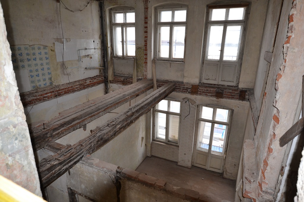 Nr. 18 ist vor einigen Jahren schon baulich gesichert worden, Nr. 17 hingegen ist so marode, dass erstmal etliche aufwendige Arbeiten nötig sind. Mit Kran und Befahrkorb wurde der Dachstuhl abgetragen, weil ein Betreten des Dachgeschosses zu gefährlich gewesen wäre. Später zimmern Handwerker den Dachstuhl neu. Die Holzbalkendecken zwischen den einzelnen Etagen werden nach und nach durch Stahlbetondecken ersetzt.